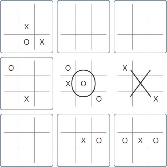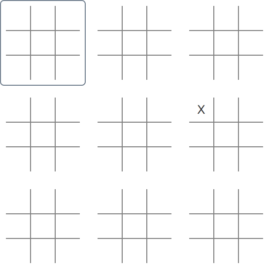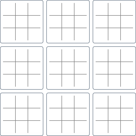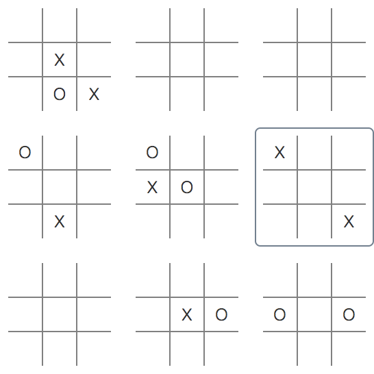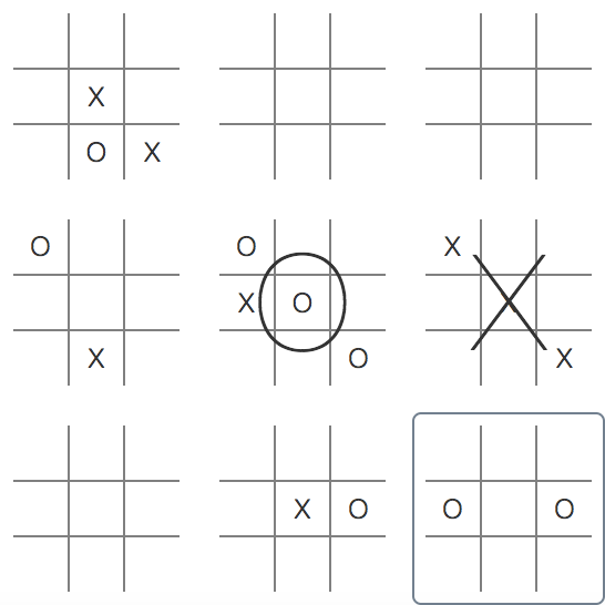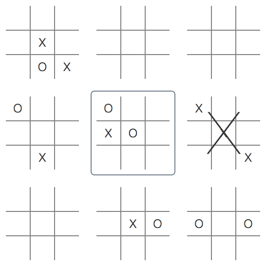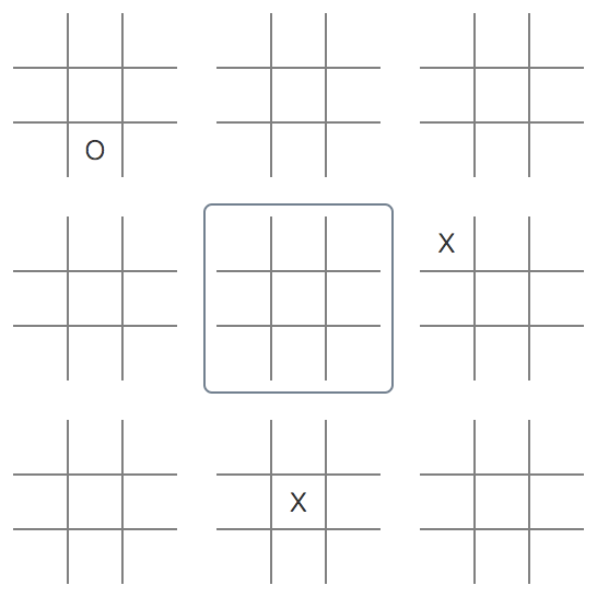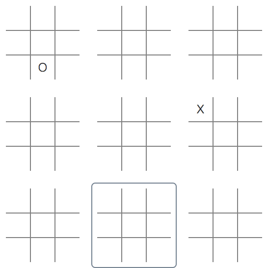 In this case, X chose to move in the northwestern corner of one of the smaller boards. This means on the next turn, O is forced to move in the northwestern board. The board that O is forced to move in is outlined in blue-gray.